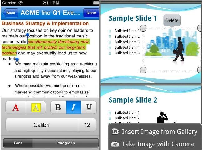 Se trata de un software de pago que está disponible por algo más de siete euros y que nos permitirá editar documentos Word, Excell y ahora de PowerPoint a través de nuestros dipositivos móviles. Además nos ofrece sincronización con cuentas de almacenamiento online, como pueden ser Dropbox, Google Docs, SugarSync o MobileMe, por ejemplo para compartir archivos que hayamos creado y guardado en local.