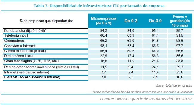 Crece el porcentaje de microempresas con Internet y página web en España situándose en 2010 en el 25%, 3 puntos porcentuales más que el año anterior, y en el caso de las microempresas de 3 a 9 empleados, supera el 40%. Aunque es un sector este que todavía tiene mucho recorrido.