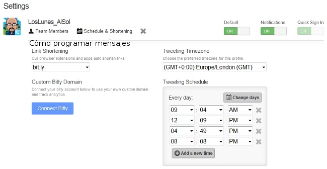 Hootsuite es uno de mis servicios favoritos. En la cuenta gratuita nos permite programar mensajes de forma individual, mientras que la cuenta Pro, nos permite realizar la programación en lote de hasta cincuenta mensajes. Esta es una opción muy útil cuando se quieren realizar acciones promocionales de un lanzamiento de un producto y queremos que tenga la máxima difusión posible. Las redes en las que se pueden programar los mensajes son Facebook, Twitter, LinkedIn, Google + (sólo en la versión pro) y alguna más.