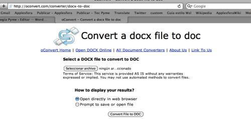 Para convertir los formatos nuevos de Office (versión 2007) y otros formatos existe un servicio online que nos hace el trabajo sucio. Sólo debemos ir a este enlace, oConvert y subir el documento, en cuestión de poco tiempo tendremos el documento en un formato que abriremos sin mayores problemas.