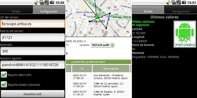 Se trata de un agente del servidor Pandora FMS, una solución de software libre que nos permite monitorizar en las empresas muchas variables, desde redes hasta servidores, comunicaciones o aplicaciones web. En este caso se ha desarrollado un cliente para móviles Android que permite extraer datos de las mismas como datos geolocalizados haciendo uso del GPS, pero también estado de la batería, orientación, proximidad o datos de la memoria usada del dispositivo.