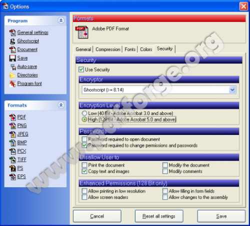 Además de PDF, puedes crear archvos de los siguientes formatos: PNG, JPG, TIFF, BMP, PCX, PS, EPS.
