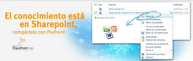 PiuPoint Publisher que nos permite compartir los documentos que tenemos en SharePoint con un sólo click. Nos aparecerá la opción de promover en el menú contextual que nos facilita compartirlo en la red social interna. Además podemos compartirla también en las redes sociales habituales. Si no tenemos permisos para ver el documento, aunque lo recibamos en Twitter o Facebook no podremos abrirlo.