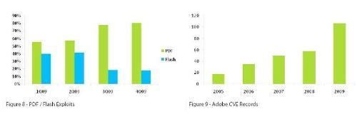 Según un informe de ScanSafe, Adobe y sus productos Reader y Acrobat ha concentrado en el último trimestre de 2009 un 80% de los ataques de software, seguido por Flash, otro de sus productos con un 18% de los ataques. Desde luego esta es una buena razón para tener este software actualizado o en caso de ser posible utilizar otras alternativas que no son foco de tanta atención por el cibercrimen.