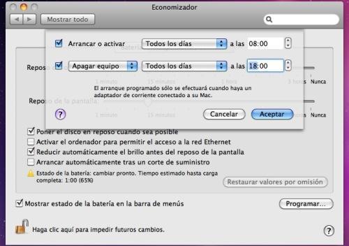 Si usamos equipos Mac el programar tanto el encendido como el apagado es una tarea sencilla que no nos llevará más de un par de clic de ratón. Para ello vamos al Panel de preferencias -> Economizador y ahí pulsamos en Programar.