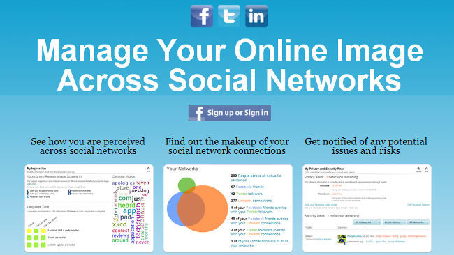 Para acceder a Reppler, sólo tenemos que identificarnos con nuestra cuenta de Facebook para comenzar el análisis. Nos va a ofrecer información sobre lo que otros usuarios perciben de nosotros según los mensajes que publicamos en las redes sociales, contenido inapropiado que hayamos podido publicar y no lo hayamos detectado como tal, etc.