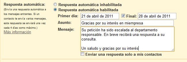 Ahora que estamos de puente o deseado comenzarlo seguro que muchos de vosotros habéis puesto el mensaje de ausente por vacaciones característico del correo electrónico. Los que tienen suerte y van a estar de vacaciones unos días más lo normal es que dejen un mensaje indicando con quién pueden contactar en la empresa en su ausencia. Esta misma deferencia hacia la persona que desea contactar con nosotros debemos tenerla también articulando una respuesta automática en los contactos que nos llegan de la web.