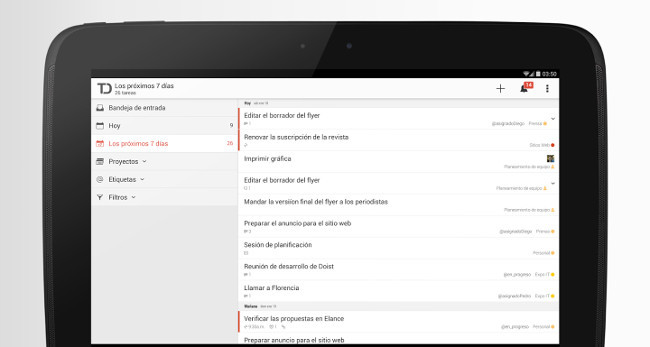 Gestión de tareas donde seguimos disfrutando de la posibilidad de poder crear subtareas, etiquetas, filtros, asignar prioridad a las tareas, establecer alertas, recordatorios vía e-mail, SMS o notificaciones push.