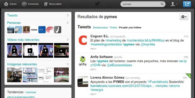 Ahora Twitter nos ofrece el resultado de nuestra búsqueda entre los comentarios que han realizado los usuarios a los que seguimos, de manera que tengamos una forma sencilla de encontrar información de un determinado tema compartida por gente que consideramos importante para seguir sus actualizaciones. De esta manera tendrán más importancia aún las personas o empresas a las que seguimos y los contenidos que deciden compartir.