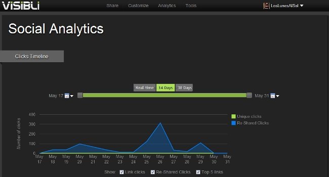 Todos estos datos podemos obtenerlos en tiempo real, o a lo largo de un periodo de tiempo, ya sea este de dos semanas o un mes. Podemos segmentar los periodos para conseguir analíticas diarias sobre los distintos enlaces que hemos compartido y ver como han evolucionado.