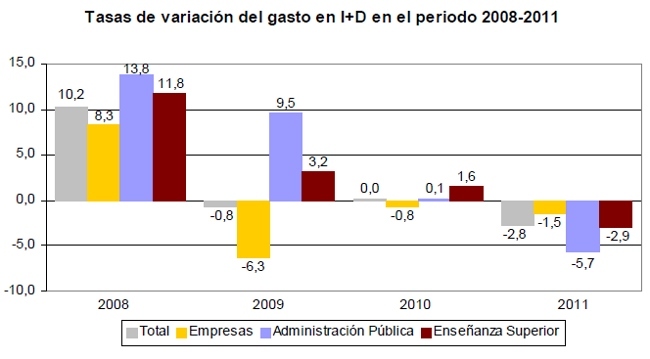 A nivel global, el gasto en I+D alcanzó los 14.184 millones de euros en el año 2011, con un descenso del 2,8% respecto a 2010 y un 26% respecto a 2008. Por lo que respecta al personal ocupado en actividades que tienen que ver con el I+D, el número de personas experimentó un descenso del 3,1% respecto del año anterior.