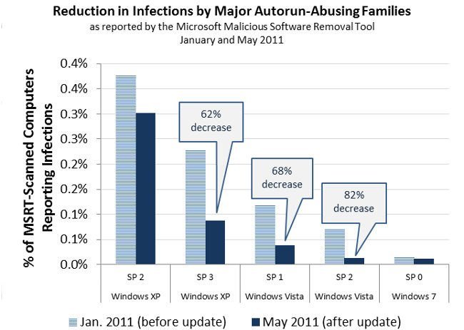 Aunque la reducción es más que significativa muchos pensarían que al desactivar el Autorun la tendencia sería en la gráfica debería ser próxima a cero, pero según explican desde Microsoft, este tipo de malware utiliza múltiples vectores para propagarse, no sólo el Autorun, como puede ser la propagación por los recursos de red compartidos o enmascararse en otro tipo de programas o familias de malware.