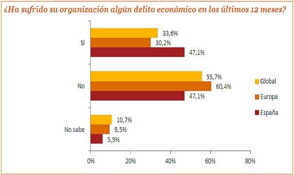 Los datos de 2011 son, cuanto menos sorprendentes, casi la mitad de las empresas españolas (el 47%) reconoce haber sido víctima de algún tipo de fraude. Un porcentaje muy superior al de las compañías europeas, del 30,2%, y al declarado por las propias empresas españolas en 2009 (34,5%). Los motivos: la escasez de recursos, junto con las difíciles circunstancias económicas por las que atraviesa España, se ha convertido en un caldo de cultivo perfecto para la proliferación de los delitos económicos en nuestro país.